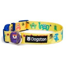 Este collar para perros y gatos es fantástico si te gustan los monstruos adorables. Está elaborado con cinta de poliéster suave y resistente. El collar es flexible, dispone de una hebilla plástica sólida y una etiqueta de goma con el logo “Dogston”. El estampado de monstruos es de calidad, con colores alegres. Las costuras son robustas.
